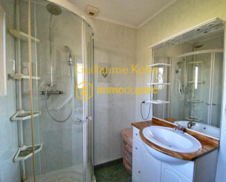 -au RDC : belle pièce de vie donnant sur la terrasse extérieure couverte, coin cheminée pour l’hiver, cuisine séparée (possibilité d’ouverture), un coin nuit avec chambre – salle d’eau et WC, un coin buanderie. L’accès par la cuisine ou le salon sur la terrasse et le jardin est très agréable. Belle vue sur les montagnes.